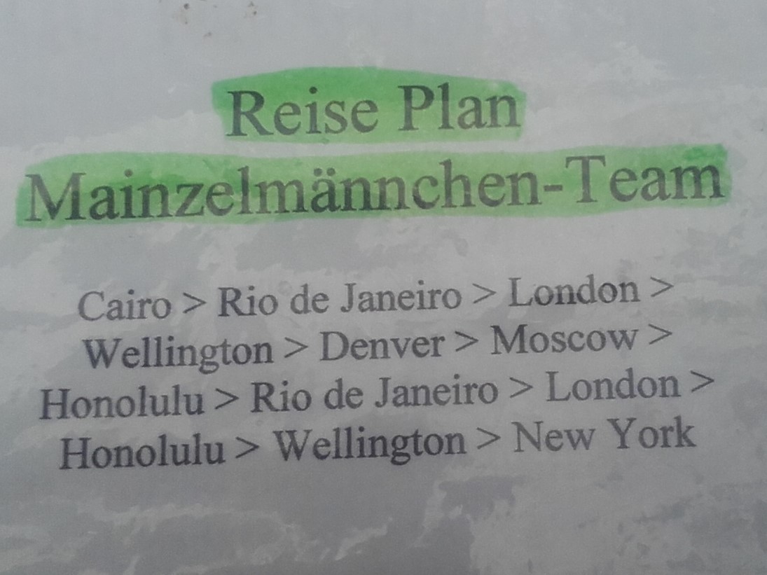 Neben köstlicher Verpflegung wurde mir ein selbstgemachtes Kreuzworträtsel vorgesetzt. Anschließend besuchten wir den Cache GC561TX, den wir aber noch nicht erfolgreich loggen konnten. Uns fehlte noch die Logik, wie wir die Weltreisepläne der Mainzelmännchen in den vierstelligen Code übersetzen konnten, mit dem das Logbuch gesichert war ...