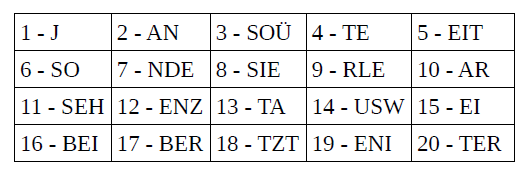 Summiere die Multiplikationen von Anzahl Raumzellen Zeile i mal Anzahl Raumzellen Zeile (9- i+1) für i = 1..4. Die Zielzahl j sei die iterierte Quersumme der Summe.
