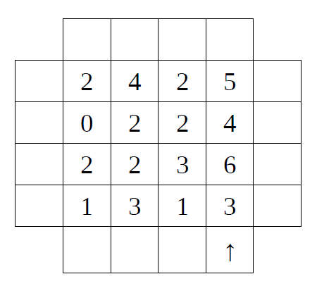 Zähle alle Pfeile, die nicht senkrecht auf das Nachbarfeld zeigen. Die Zielzahl o ist die iterierte Quersumme dieser Anzahl.